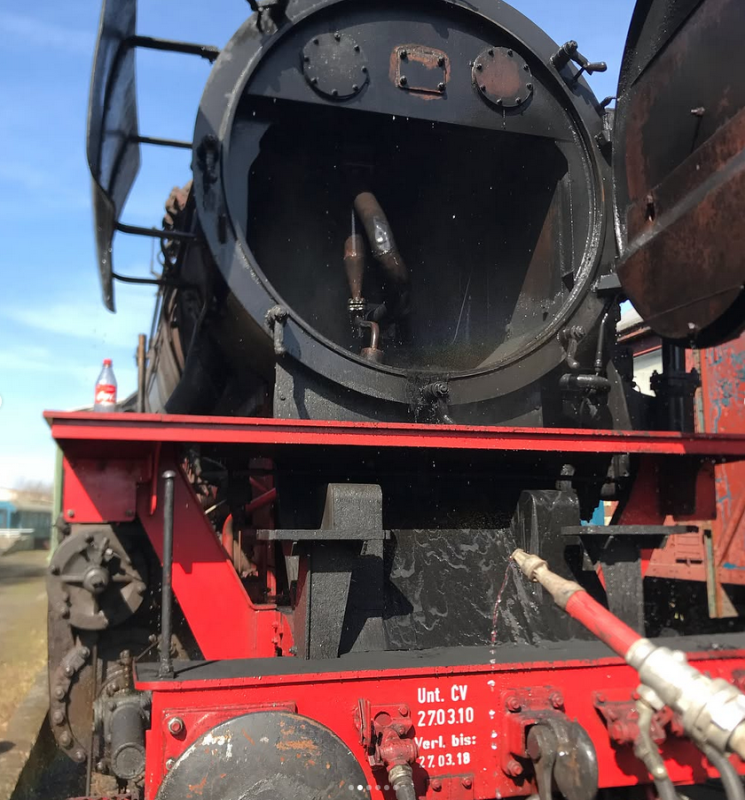 07.04.2018: Nach Ablauf der Fristen wurde als erstes der Kessel ausgewaschen. Das heißt alle Waschluken wurden geöffnet, der Bodenring, die Rauch- und Heizrohre, die Feuerbüchse und die Rauchkammer wurden gründlich ausgespült.