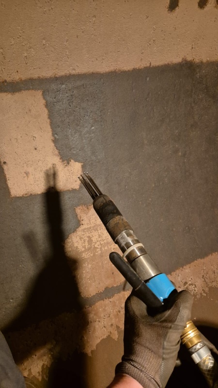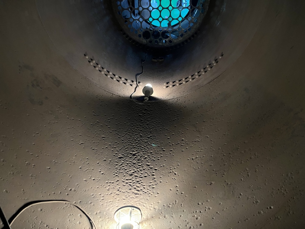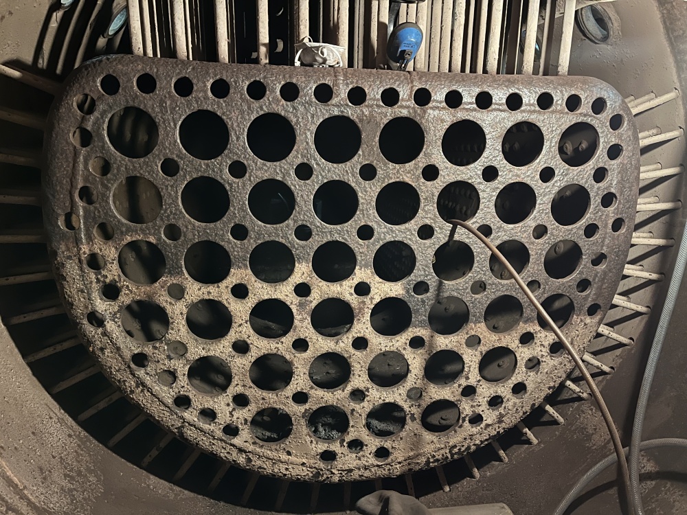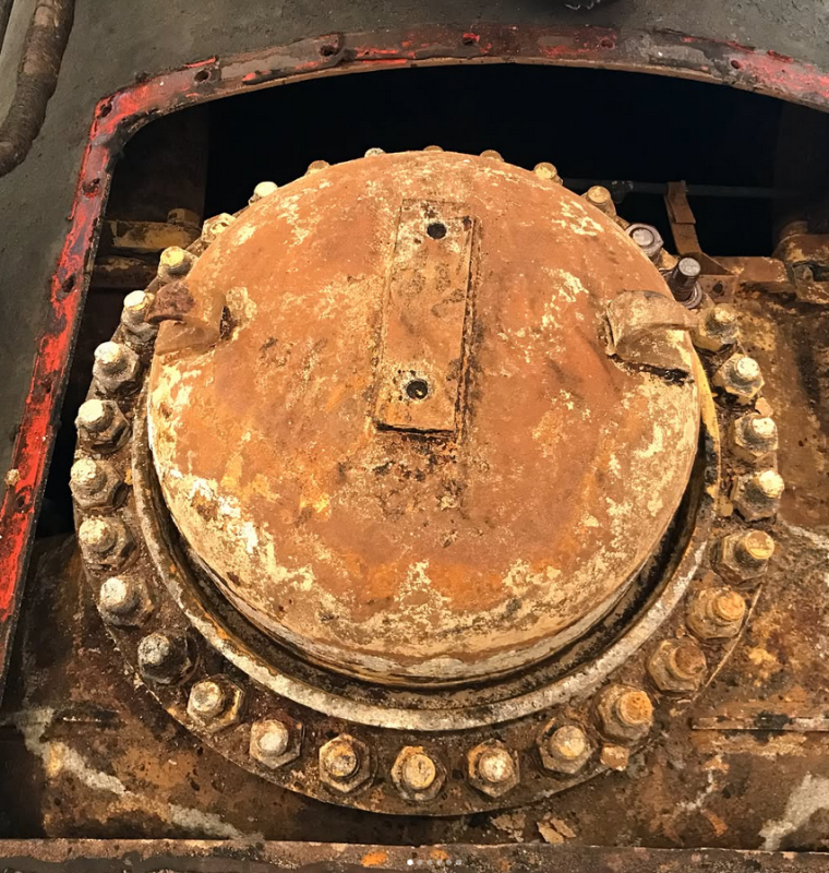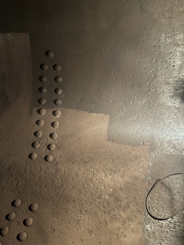 21.02.2024: Der grobe Rost und Kesselstein wurde aus dem Kessel bereits herausgefegt. Danach musste mit Hilfe eines Druckluftnadlers der restliche, an der Kesselwand festsitzende, Kesselstein entfernt werden. Gut zu sehen sind die bereits gereinigten Stellen der Kesselwand. Dieses Unterfangen ist wichtig, damit der Kesselprüfer später eine Wanddickenmessung durchführenn kann, um zu überprüfen wie viel Material bereits vom Kessel abgezehrt ist.