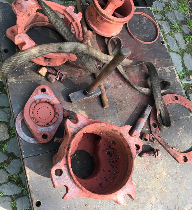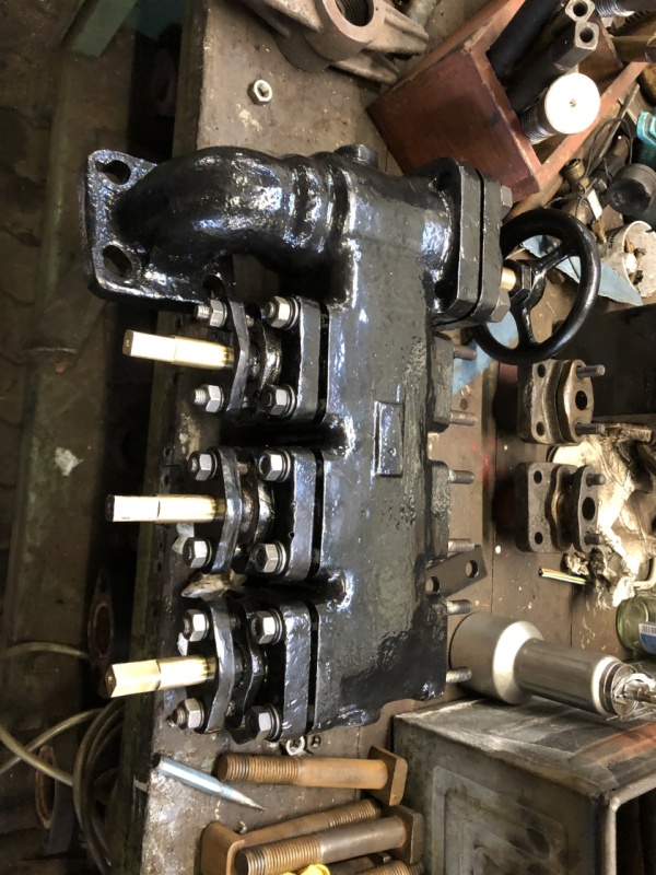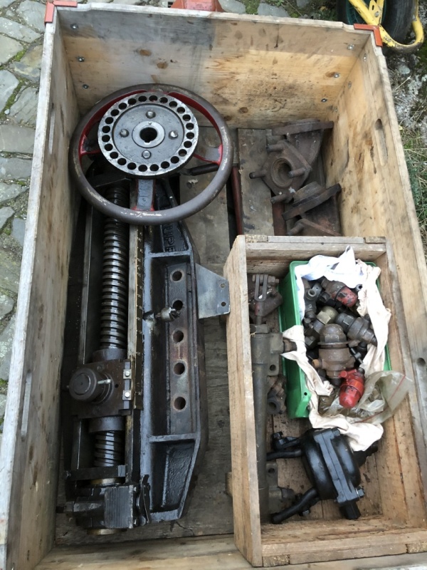 19.10.2019: Viele Teile werden abgebaut und entweder selbst aufgearbeitet oder zur Aufarbeitung verschickt. Beispielsweise hier der Steuerbock, Steuerrad, Speiserohrkrümmer und einige Ölsperren.