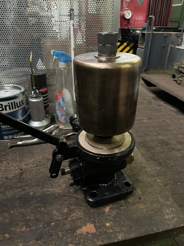 27.09.2020: Mit Hilfe der Eisenbahnwerkstätten Krefeld wurden beide Schieberbuchsen der Zylinder ausgebohrt. Dafür wurde eine spezielle Bohrmaschine an den Zylinder geschraubt.