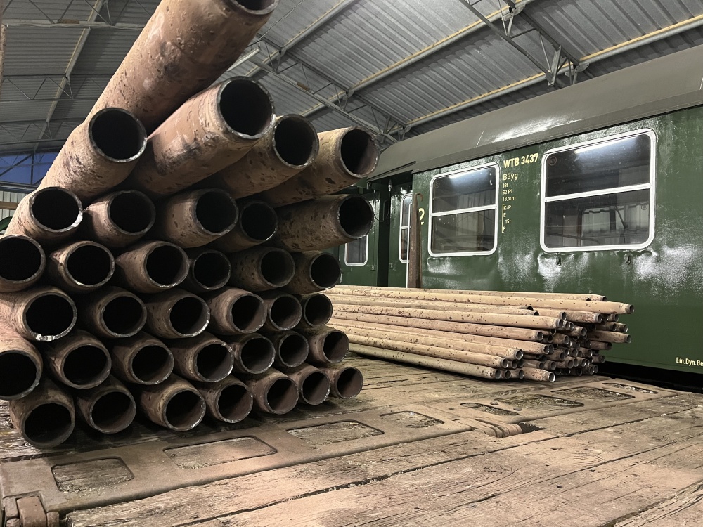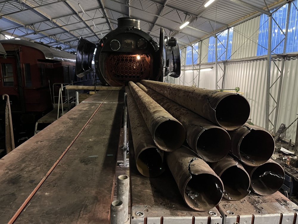 28.09.2023: Nun stand der Ausbau der Kesselrohre bevor. Nachdem die Schweißnaht der Rohre auf der Seite der Feuerbüchse abgebrannt und rauchkammerseitig eingetrennt wurde, konnte man die Rohre herausziehen. Mit Hilfe einer Seilwinde, ging dies doch erstaunlich leichter.