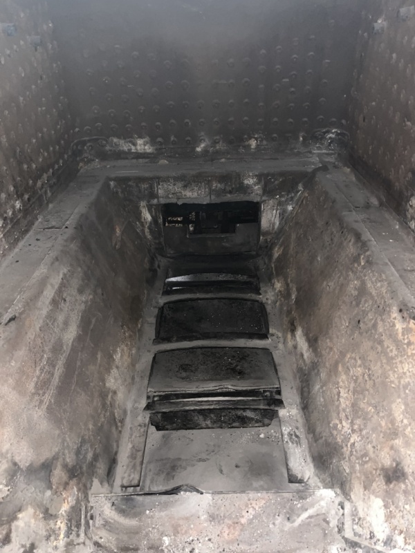 01.02.2025: Da nun der Kessel in naher Zukunft abgenommen wird, muss auch die komplette Ausmauerung der Dampflokomotive ausgebaut werden. Hier sieht man schon die blanke Feuerbüchse ohne die Schamottsteine und dem Feuerschirm. Auch die Öl-Kohle, die im Laufe der Zeit auf dem Boden vor den Öl-Brennern entstanden ist, wurde herausgemeißelt.